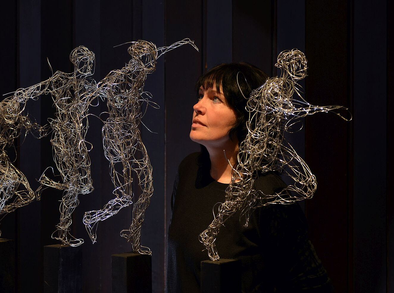 Die Heidelbergerin definiert Drähte als energetische Bahnen. Die Verwirbelungen drücken fulminante Dynamik aus. Diese erfährt vielfach eine Steigerung: Die Gestalten erscheinen beim Sprinten, Laufen, Springen, Tanzen, Fliegen oder Klettern. Es geht um das Weiter, das Nach-Oben, das Nach-Vorn.