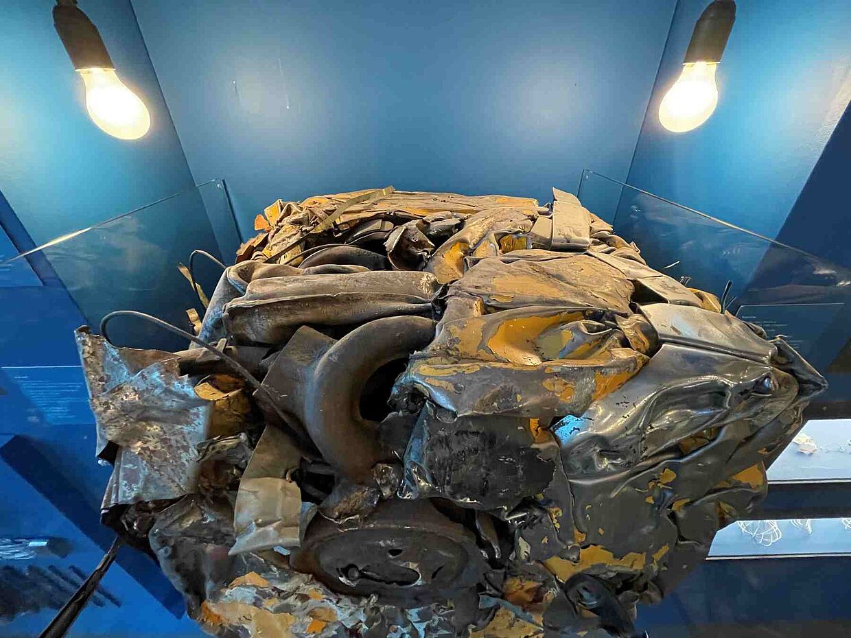 Der Opel Manta stammt aus dem Jahr 1982. Im Deutschen Drahtmuseum wird er allerdings als ein gepresster Block Eisenblech präsentiert. Derartiger Schrott wird in der Regel eingeschmolzen und zu Walzdraht verarbeitet.