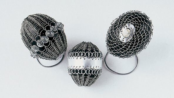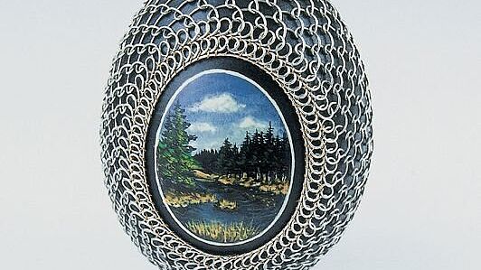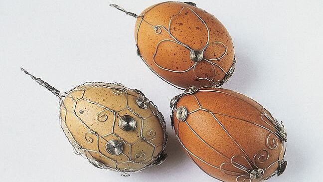 Wir kennen zahlreiche Methoden, Ostereier zu schmücken. Doch dass die zerbrechlichen Schalen mit kunstvoll gebogenen Drähten ummantelt werden, stellt für Viele ein Novum dar. Die Ausstellung präsentierte rund 300 auf diese Weise von zeitgenössischen Drahtbindekünstlern dekorierte Ostereier. Sie alle stammten aus dem Považké múzeum in Žilina (Slowakische Republik), das nicht von ungefähr eine umfangreiche Sammlung von Drahtostereiern besitzt.